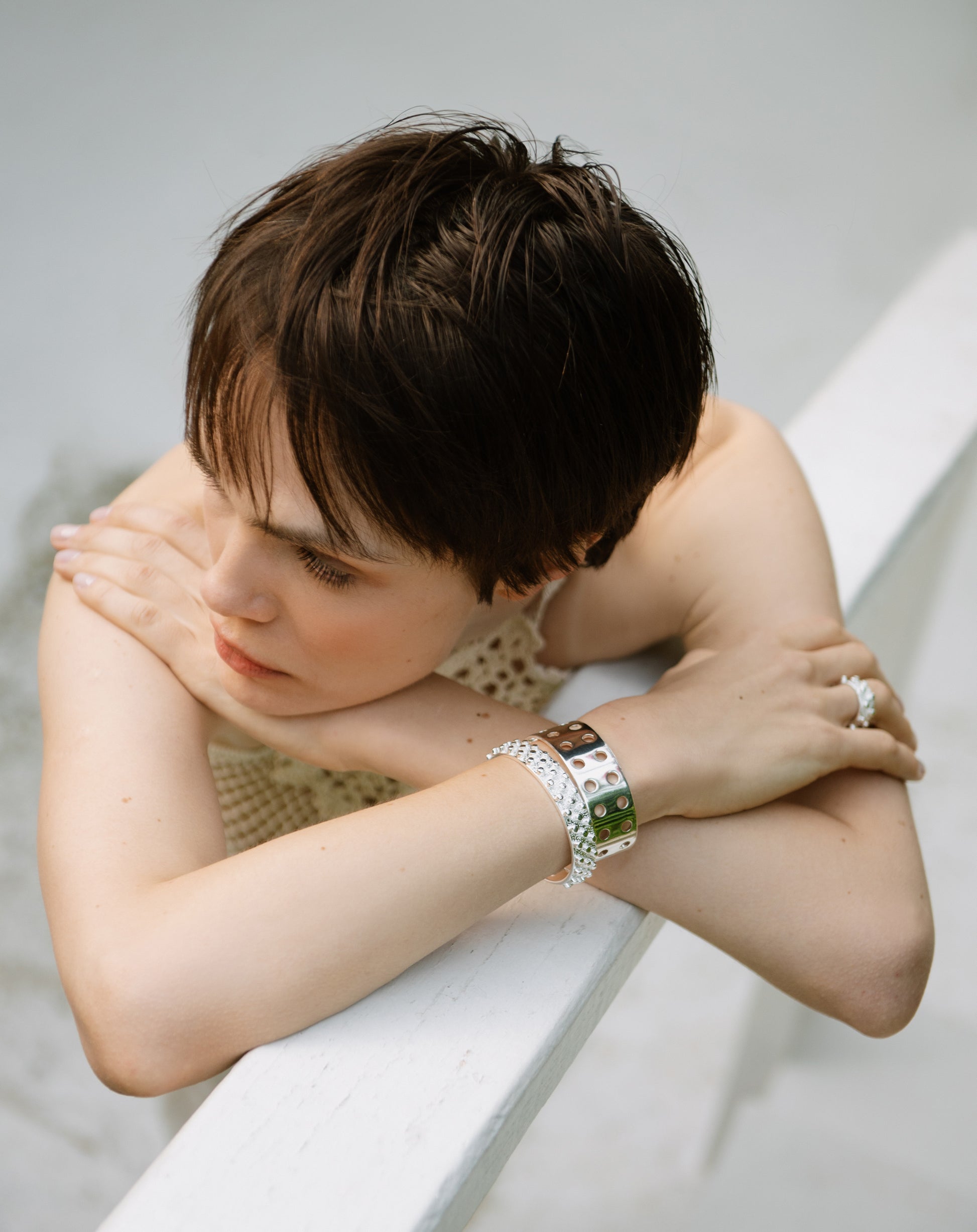 Este bracelete é uma escultura vestível delicada e não deve ser ajustado manualmente. Entre em contato conosco se tiver dúvidas sobre o tamanho.